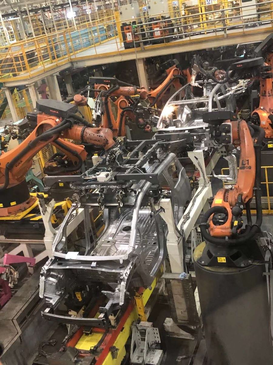 当天上午10时许,拓普泰克中高层管理人员首先参观了广汽乘用车有限公司焊装车间,完美的车身冲压件成型后就会被送到焊装工艺环节,构筑完整的车身。焊装车间拥有世界领先的ABB和库卡机器人近200余台,自动线采用自适应焊接技术,通过MES(制造执行系统)与RFID(无线射频识别系统)互联,实现了车型、配置的自动识别,既保证了品质又提高了产量。