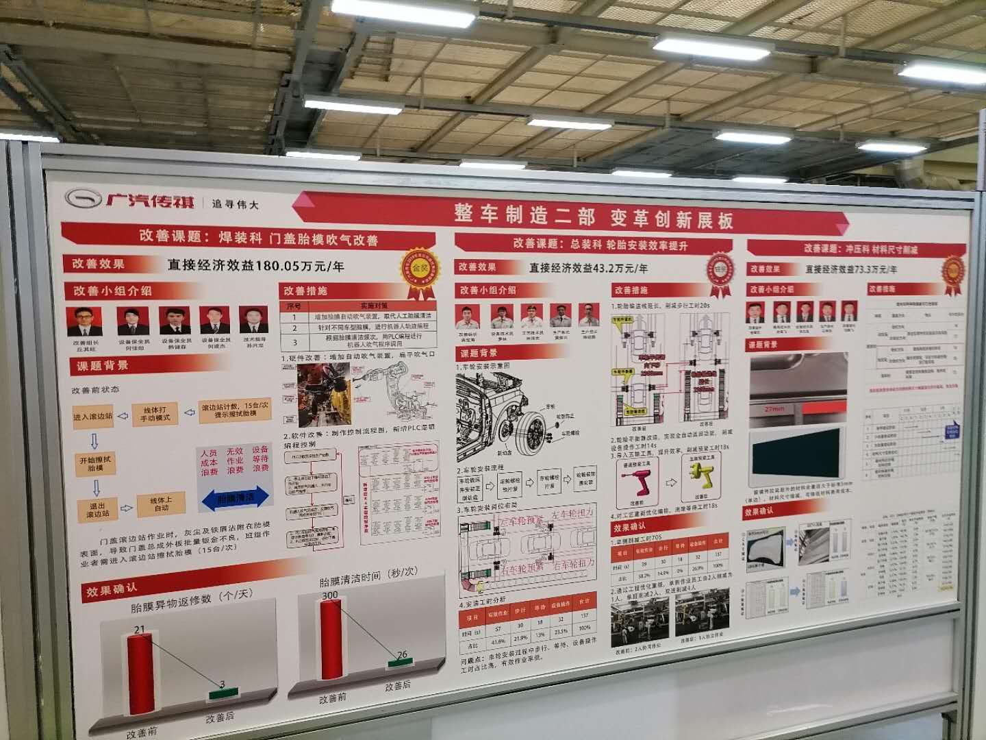 广汽传祺的成功经验有很多,对我们公司管理有借鉴意义的主要有以下三点:一是十分注重创新,除了设立广汽传祺研究院以外,给我们印象最深的是,它将创新融入日常管理的方方面面,强调全员创新,充分发挥基层员工的聪明才智,鼓励基层员工针对生产工艺进行创新,为此成立改善课题小组,对取得良好经济效益的给予重奖,并且通过变革创新展板的设立,及时激励员工,取得良好效果。
